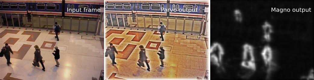 Retina processing on RGB image sequence : example from http://changedetection.net/ (baseline/PETS2006). Parvo enforces static signals but smooths moving persons since they do not remain static from its point of view. Magno channel highlights moving persons, observe the energy mapping on the one on top, partly behind a dark glass.