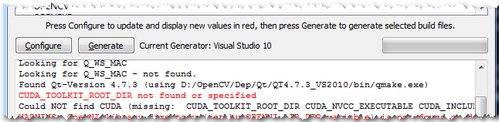 Select all the packages you want to use and press again the Configure button. For an easier overview of the build options make sure the Grouped option under the binary directory selection is turned on. For some of the packages CMake may not find all of the required files or directories. In case of these, CMake will throw an error in its output window (located at the bottom of the GUI) and set its field values to not found constants. For example:
