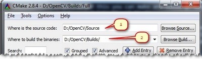 Now start the CMake (cmake-gui). You may again enter it in the start menu search or get it from the All Programs –> CMake 2.8 –> CMake (cmake-gui). First, select the directory for the source files of the OpenCV library (1). Then, specify a directory where you will build the binary files for OpenCV (2).