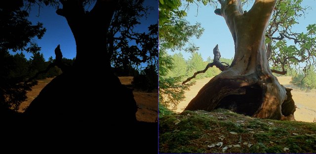 In the figure below, the OpenEXR image sample CrissyField.exr, a High Dynamic Range image is shown. In order to make it visible on this web-page, the original input image is linearly rescaled to the classical image luminance range [0-255] and is converted to 8bit/channel format. Such strong conversion hides many details because of too strong local contrasts. Furthermore, noise energy is also strong and pollutes visual information.