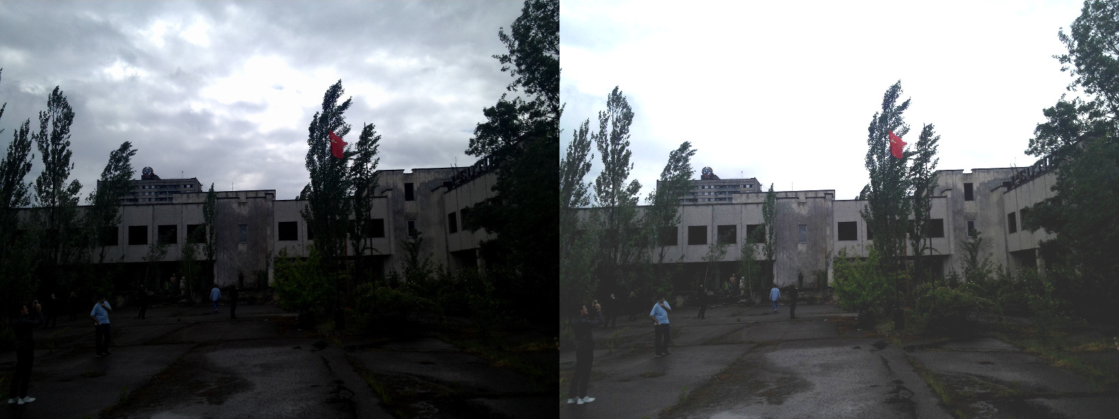The overall brightness has been improved but you can notice that the clouds are now greatly saturated due to the numerical saturation of the implementation used (highlight clipping in photography).