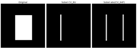 In our last example, output datatype is cv.CV_8U or np.uint8. But there is a slight problem with that. Black-to-White transition is taken as Positive slope (it has a positive value) while White-to-Black transition is taken as a Negative slope (It has negative value). So when you convert data to np.uint8, all negative slopes are made zero. In simple words, you miss that edge.