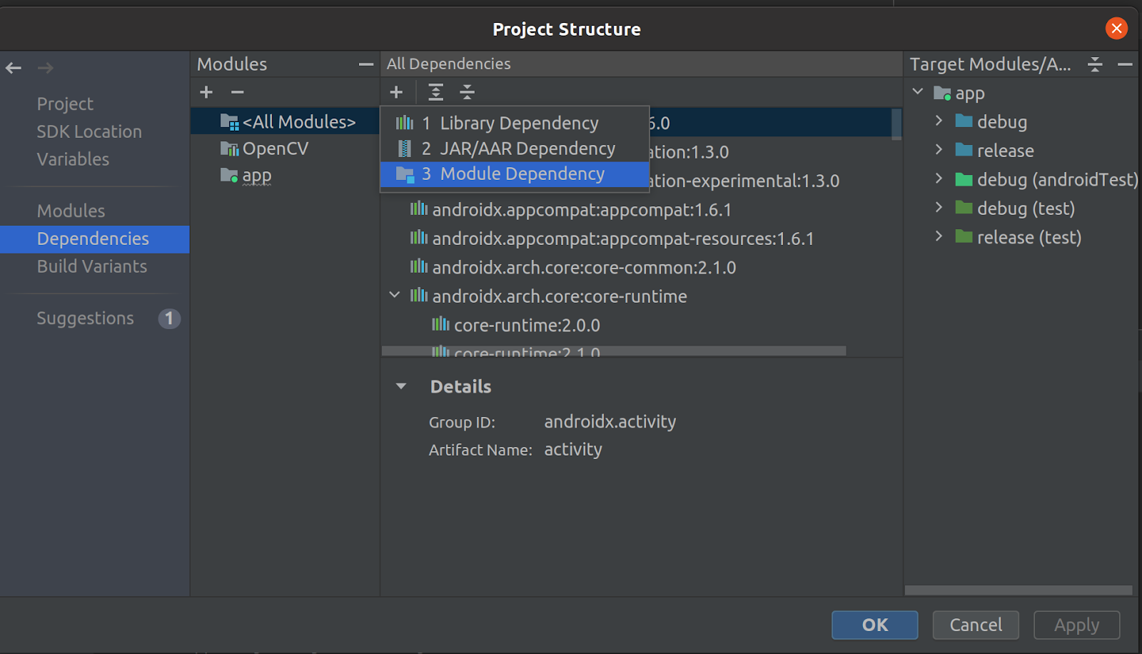 - Choose Minumum SDK with the version number not less than OpenCV supports. For 4.9.0 minimal SDK version is 21.