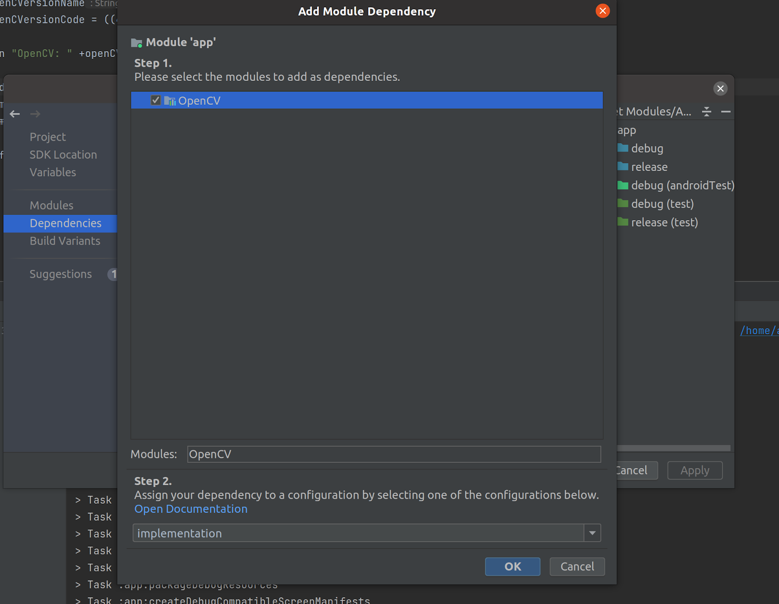 build.gradle and add OpenCV library to Dependencies list like this: dependencies {