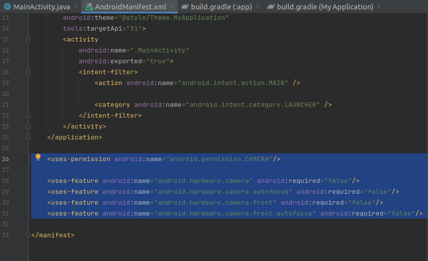 MyApplication/app/src/main/AndroidManifest.xml: <uses-permission android:name="android.permission.CAMERA"/>