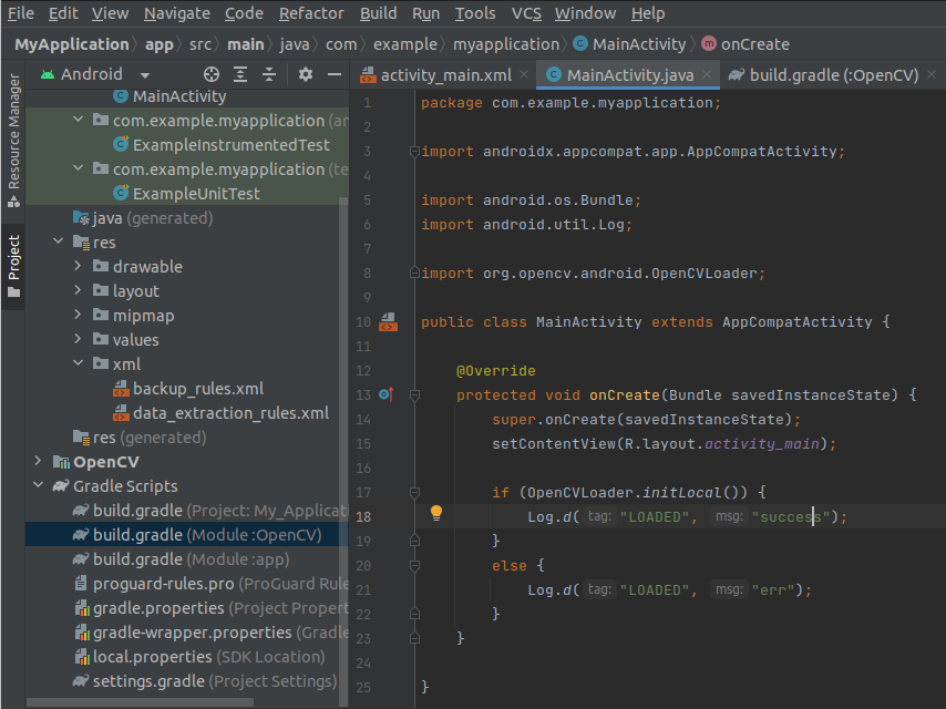 - Before using any OpenCV function you have to load the library first. If you application includes other OpenCV-dependent native libraries you should load them after OpenCV initialization. Add the folowing code to load the library at app start: