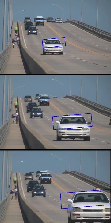 Did you closely watch the last result? There is a problem. Our window always has the same size whether the car is very far or very close to the camera. That is not good. We need to adapt the window size with size and rotation of the target. Once again, the solution came from "OpenCV Labs" and it is called CAMshift (Continuously Adaptive Meanshift) published by Gary Bradsky in his paper "Computer Vision Face Tracking for Use in a Perceptual User Interface" in 1998 [41] .