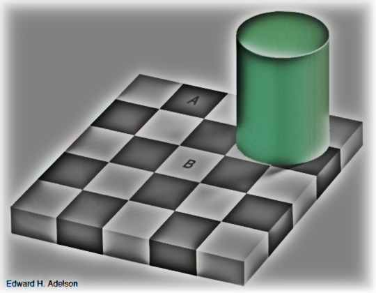 Looking at the checkerboard image below, human eyes perceive the "B" square lighter than the "A" square, although they are pictured in the very same RGB color. Of course in the physical world, checkerboard has a "B" square which is lighter than "A", but in this image the shadow of the green cylinder casting over the "B" square ends up in making the "A" and "B" squares actually having the same luminance.
