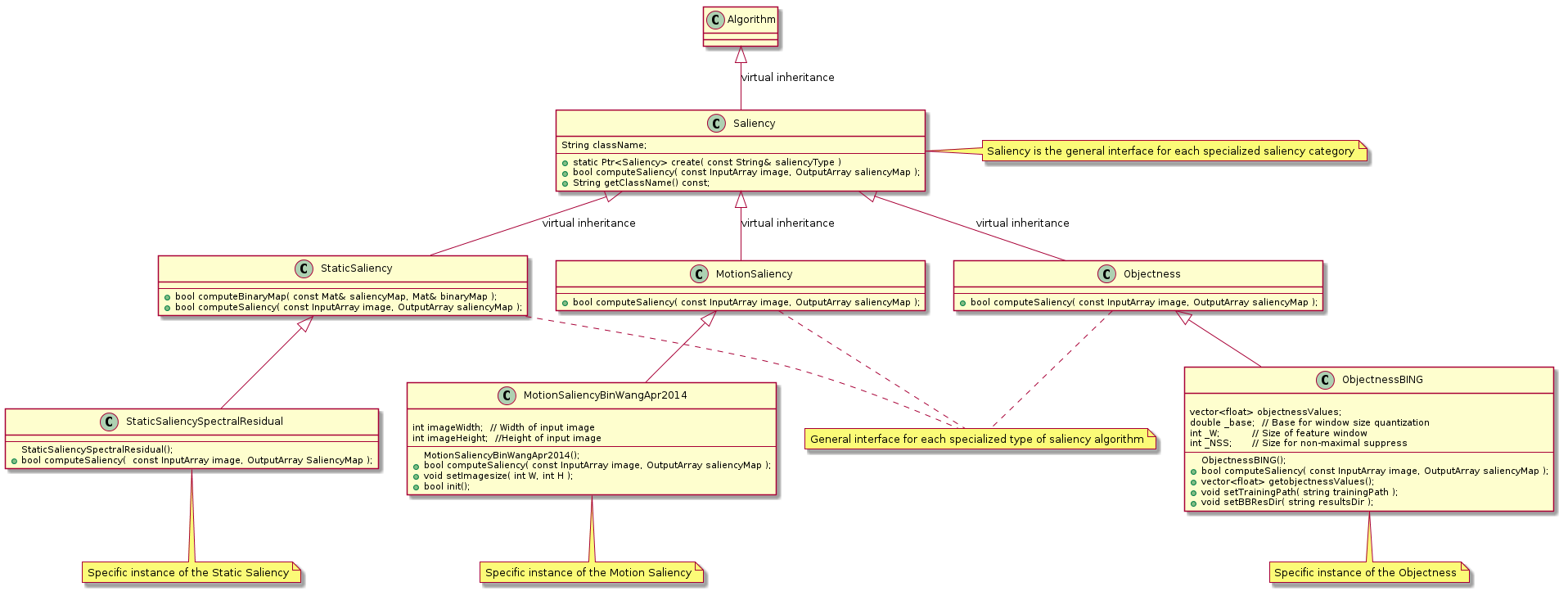 About the saliency, there is a rich literature but the development is very fragmented. The principal purpose of this API is to give a unique interface, a unique framework for use and plug sever saliency algorithms, also with very different nature and methodology, but they share the same purpose, organizing algorithms into three main categories: