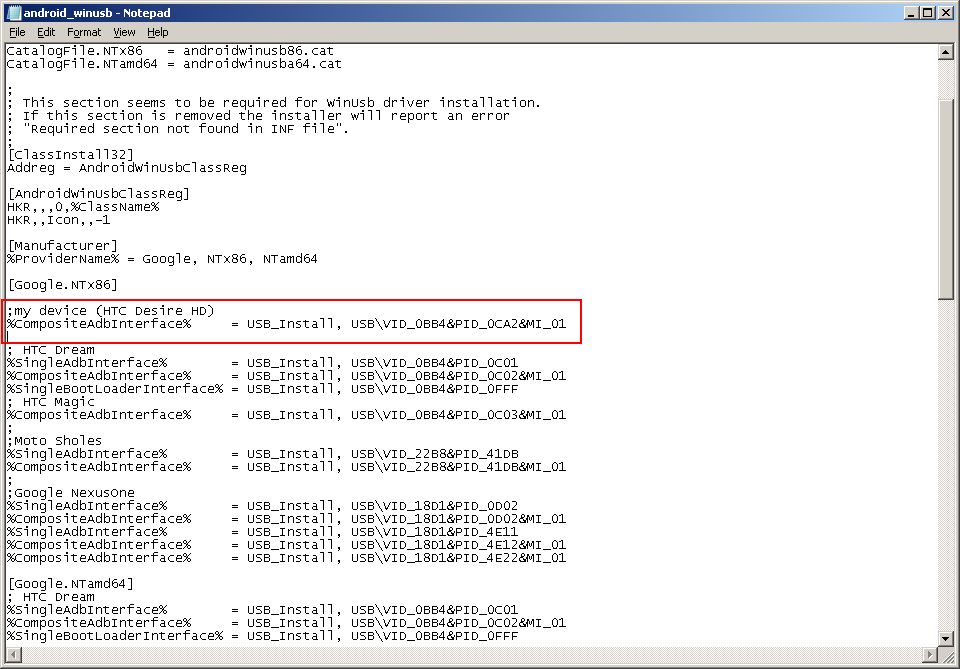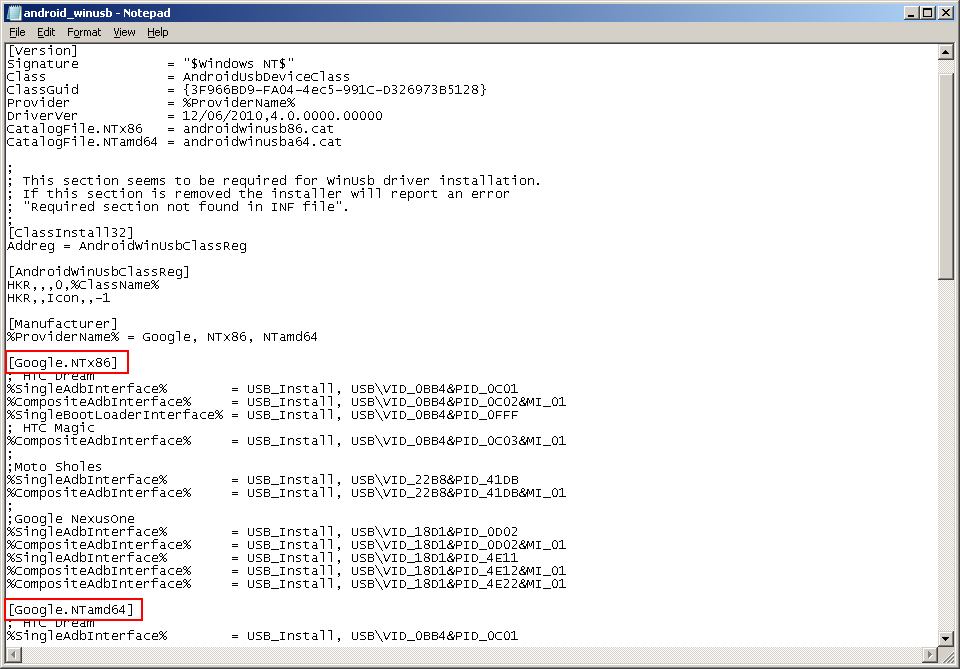 <Android SDK folder>/extras/google/usb_driver/android_winusb.inf. Select either Google.NTx86 or Google.NTamd64 section depending on your host system architecture.