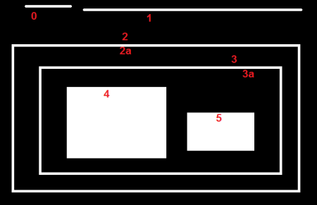 In this image, there are a few shapes which I have numbered from 0-5. 2 and 2a denotes the external and internal contours of the outermost box.