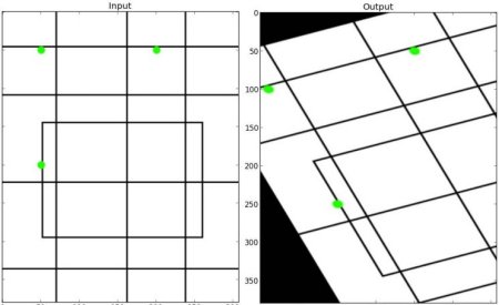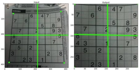 For perspective transformation, you need a 3x3 transformation matrix. Straight lines will remain straight even after the transformation. To find this transformation matrix, you need 4 points on the input image and corresponding points on the output image. Among these 4 points, 3 of them should not be collinear. Then the transformation matrix can be found by the function cv.getPerspectiveTransform. Then apply cv.warpPerspective with this 3x3 transformation matrix.