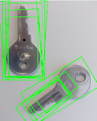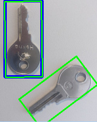 The blue rectangle shows the result of cv::GeneralizedHoughBallard and the green rectangles the results of cv::GeneralizedHoughGuil.