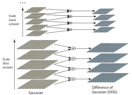 But this LoG is a little costly, so SIFT algorithm uses Difference of Gaussians which is an approximation of LoG. Difference of Gaussian is obtained as the difference of Gaussian blurring of an image with two different \(\sigma\), let it be \(\sigma\) and \(k\sigma\). This process is done for different octaves of the image in Gaussian Pyramid. It is represented in below image: