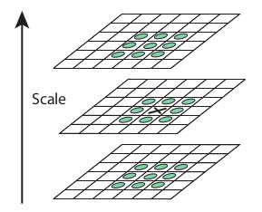 Once this DoG are found, images are searched for local extrema over scale and space. For eg, one pixel in an image is compared with its 8 neighbours as well as 9 pixels in next scale and 9 pixels in previous scales. If it is a local extrema, it is a potential keypoint. It basically means that keypoint is best represented in that scale. It is shown in below image: