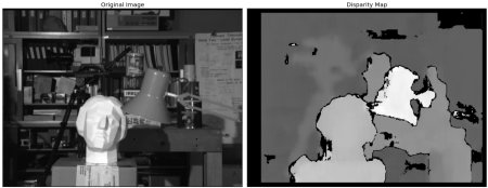 Below image contains the original image (left) and its disparity map (right). As you can see, the result is contaminated with high degree of noise. By adjusting the values of numDisparities and blockSize, you can get a better result.
