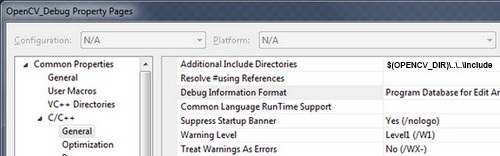 Use for example the OpenCV_Debug name. Then by selecting the sheet Right Click –> Properties. In the following I will show to set the OpenCV rules locally, as I find unnecessary to pollute projects with custom rules that I do not use it. Go the C++ groups General entry and under the "Additional Include Directories" add the path to your OpenCV include. If you don't have "C/C++" group, you should add any .c/.cpp file to the project.