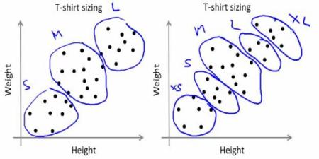 Company can't create t-shirts with all the sizes. Instead, they divide people to Small, Medium and Large, and manufacture only these 3 models which will fit into all the people. This grouping of people into three groups can be done by k-means clustering, and algorithm provides us best 3 sizes, which will satisfy all the people. And if it doesn't, company can divide people to more groups, may be five, and so on. Check image below :