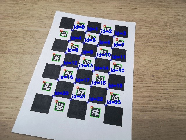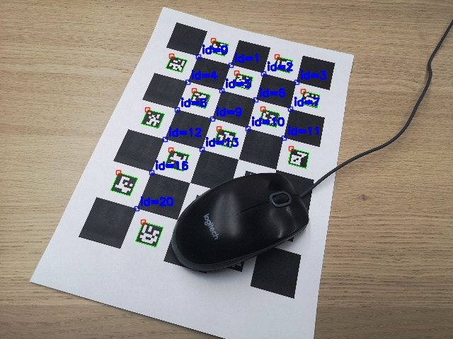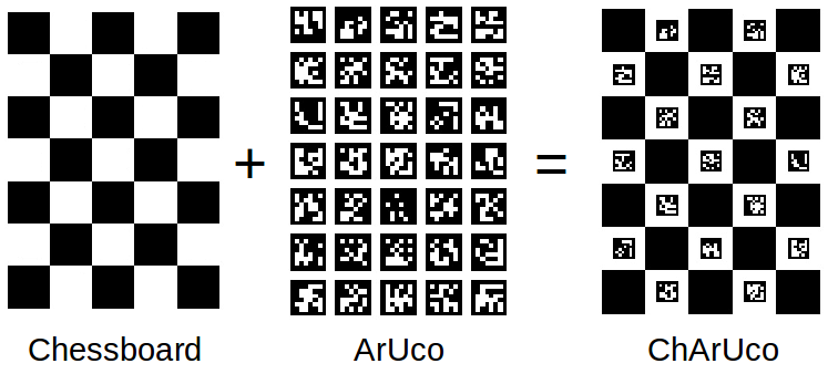 On the contrary, the corners of chessboard patterns can be refined more accurately since each corner is surrounded by two black squares. However, finding a chessboard pattern is not as versatile as finding an ArUco board: it has to be completely visible and occlusions are not permitted.
