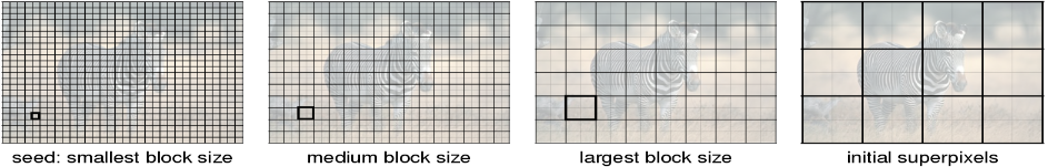 The number of levels in num_levels defines the amount of block levels that the algorithm use in the optimization. The initialization is a grid, in which the superpixels are equally distributed through the width and the height of the image. The larger blocks correspond to the superpixel size, and the levels with smaller blocks are formed by dividing the larger blocks into 2 x 2 blocks of pixels, recursively until the smaller block level. An example of initialization of 4 block levels is illustrated in the following figure.
