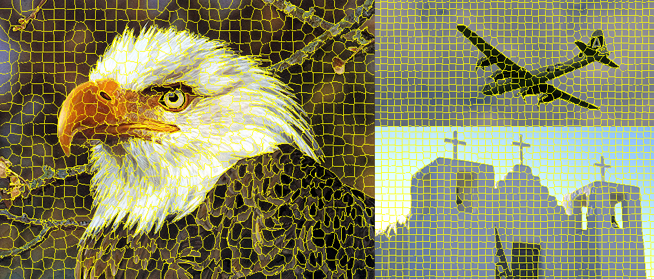 The function initializes a SuperpixelLSC object for the input image. It sets the parameters of superpixel algorithm, which are: region_size and ruler. It preallocate some buffers for future computing iterations over the given image. An example of LSC is ilustrated in the following picture. For enanched results it is recommended for color images to preprocess image with little gaussian blur with a small 3 x 3 kernel and additional conversion into CieLAB color space.