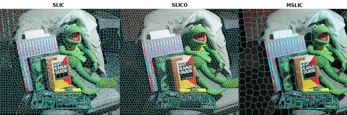 The function initializes a SuperpixelSLIC object for the input image. It sets the parameters of choosed superpixel algorithm, which are: region_size and ruler. It preallocate some buffers for future computing iterations over the given image. For enanched results it is recommended for color images to preprocess image with little gaussian blur using a small 3 x 3 kernel and additional conversion into CieLAB color space. An example of SLIC versus SLICO and MSLIC is ilustrated in the following picture.