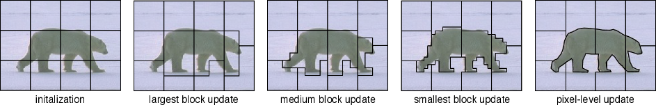 The function computes the superpixels segmentation of an image with the parameters initialized with the function createSuperpixelSEEDS(). The algorithms starts from a grid of superpixels and then refines the boundaries by proposing updates of blocks of pixels that lie at the boundaries from large to smaller size, finalizing with proposing pixel updates. An illustrative example can be seen below.
