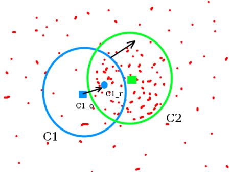 The initial window is shown in blue circle with the name "C1". Its original center is marked in blue rectangle, named "C1_o". But if you find the centroid of the points inside that window, you will get the point "C1_r" (marked in small blue circle) which is the real centroid of window. Surely they don't match. So move your window such that circle of the new window matches with previous centroid. Again find the new centroid. Most probably, it won't match. So move it again, and continue the iterations such that center of window and its centroid falls on the same location (or with a small desired error). So finally what you obtain is a window with maximum pixel distribution. It is marked with green circle, named "C2". As you can see in image, it has maximum number of points. The whole process is demonstrated on a static image below: