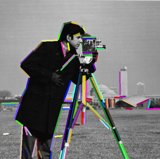 In the following snippet of code, it is shown how to detect lines from an image. The LSD extractor is initialized with LSD_REFINE_ADV option; remaining parameters are left to their default values. A mask of ones is used in order to accept all extracted lines, which, at the end, are displayed using random colors for octave 0.